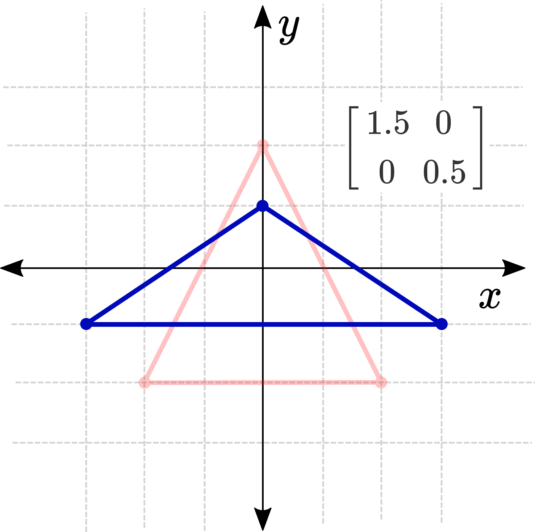 Elementet \(a\) bestemmer, hvor meget \(x_1\) påvirker \(x_2\), og elementet \(d\) bestemmer, hvor meget \(y_1\) påvirker \(y_2\). Hvis vi kun ændrer disse værdier, vil det resultere i en skalering langs \(x\)- eller \(y\)-aksen (eller begge). At reducere begge disse til nul er et særligt tilfælde, hvor hvert enkelt punkt skrumper sammen til origo!