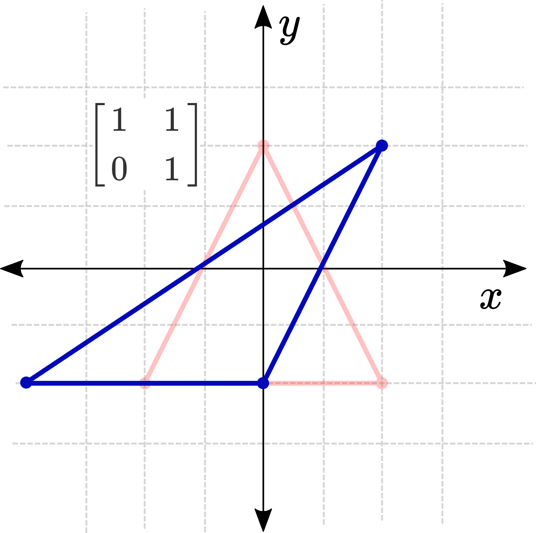 De to ikke-diagonale elementer styrer skævningstransformationen. Elementet \(b\) bestemmer, hvor meget den gamle \(y\) påvirker den nye \(x\), og elementet \(c\) bestemmer, hvor meget den gamle \(x\) påvirker den nye \(y\). Ved at holde \(a\) og \(d\) lig med 1 og justere disse ét ad gangen opnås en skæv/skæv effekt.