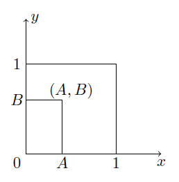 Du vælger et punkt \((A, B)\) ensartet tilfældigt i enhedskvadraten \(\{(x, y): 0 \leq x, y \leq 1\}\).
