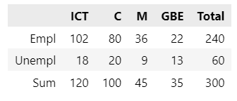 Teknisk set er summerne og totalerne ikke en del af kontingenstabellerne. De tilføjes for at gøre det nemmere at beregne sandsynlighederne.